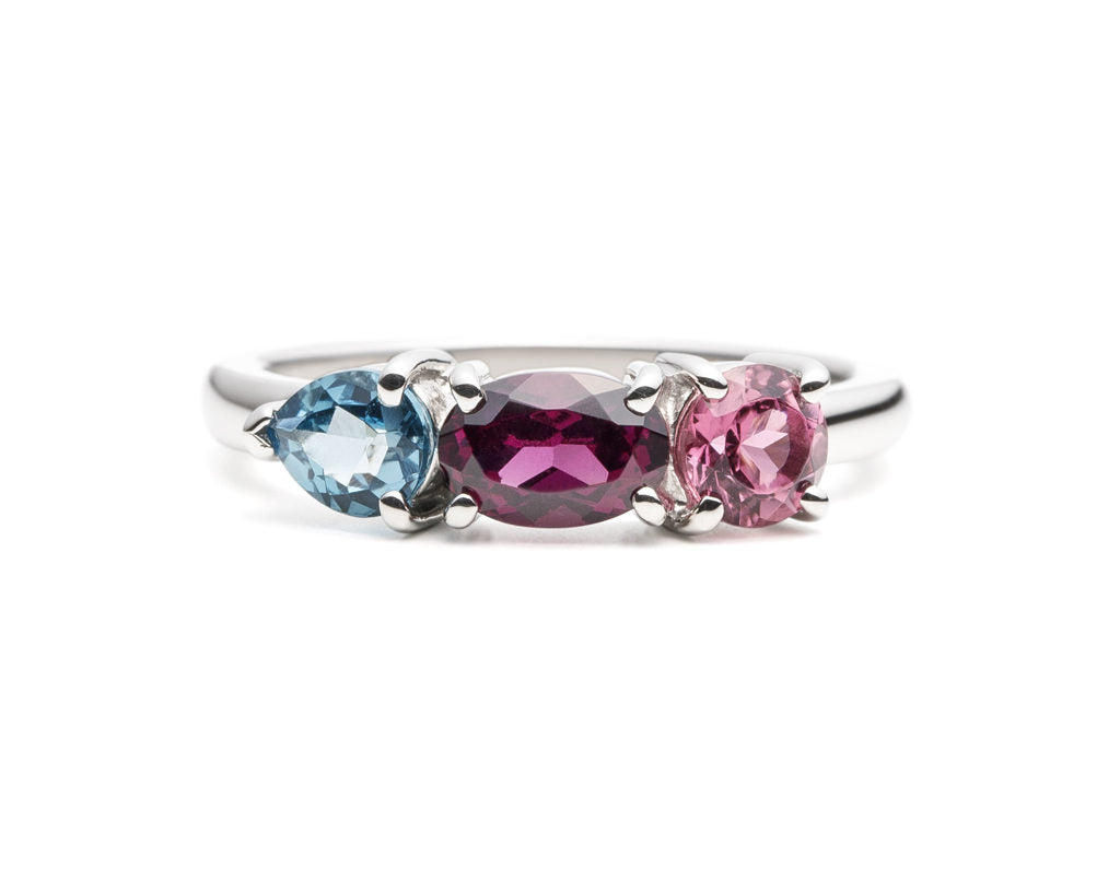 ブルートパーズは「友情」、ガーネットは「情熱」、ピンクトルマリンは「愛情」を象徴しています。